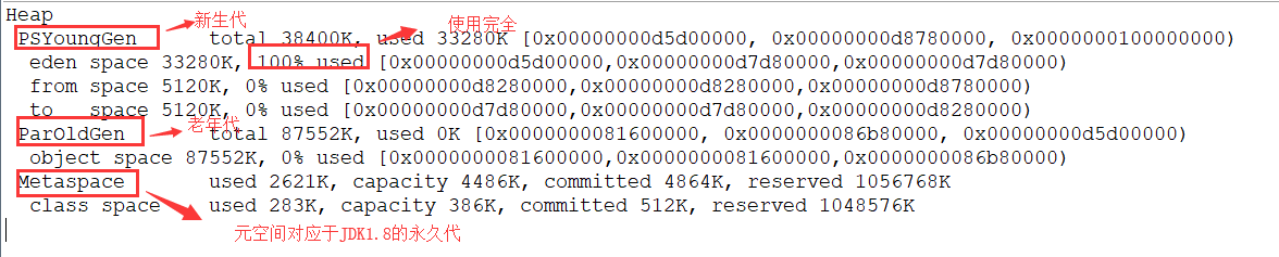 运行结果 (红色字体描述有误,应该是对应于 JDK1.7 的永久代):